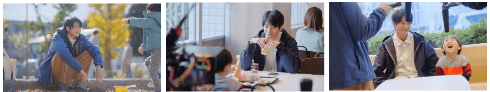 撮影現場に入った向井さんは、息子役のえいた君に早速「めがね、どっちが似合うかな?」と話しかけ、えいた君は真剣な表情で「こっち」と答えると、二人はすぐに打ち解けた様子。休憩中もえいた君が「みてみて!」と話しかけ、冷蔵庫の扉にマグネットをくっつけたり、ハッピーセットのおもちゃで一緒に遊んだりと、まるで本当の親子のように和気あいあいとした雰囲気で撮影が進みました。台本はありながら、アドリブで出たセリフもCMに採用されました。