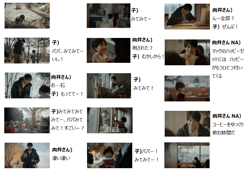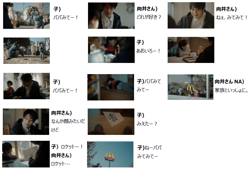本CMは、「マクドナルドのハッピーセット®にはもうひとつのハッピーがついてくる」というメッセージをこめた、ストーリーを展開。マクドナルドには、親と子それぞれのハッピーと、また家族と一緒に過ごす時間というかけがえのないハッピーがあるということを伝えることで、子育て世代の共感性を高め、気兼ねなく楽しんでいただきたいと考えています。本CMには、子育てと仕事に奮闘する父親役として俳優の向井理さんをイメージキャラクターとして起用。家事やパソコン作業の最中にも休みなく繰り出される息子からの「パパ、みてみて!」。そんな息子に向き合う慌ただしい日常の中で、ハッピーセットについてくるもうひとつのハッピー(=コーヒーをゆっくりと飲む時間)にホッと一息つく様子が描かれています。マクドナルドで過ごした家族との時間を思い出しながらご覧いただければ幸いです。