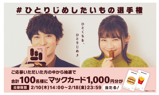 「#ひとりじめしたいもの選手権」のハッシュタグを付けて、キャンペーン対象の投稿のコメント付きリツイートで、ひとりじめしたい!と思うものを書いて投稿すると、抽選で100名様にマックカード1,000円分が当たります。