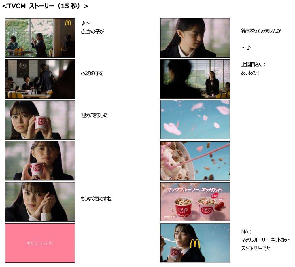 3年連続マックフルーリーのCMに出演させて頂き、とても嬉しいです!撮影時にスタッフさんが紙で作られた桜の花びらを降らせていたのですが、ひらひらと舞う姿を見て、春を先取りした気分になり、とてもウキウキしました!春の暖かさを感じるようなCMと、「春一番」のレコーディング風景を撮影したロングバージョン、どちらも楽しんで頂けたらと思います!「マックフルーリー キットカット」も大好きですが、新しいストロベリー味もとても美味しいのでぜひ食べてもらいたいです!