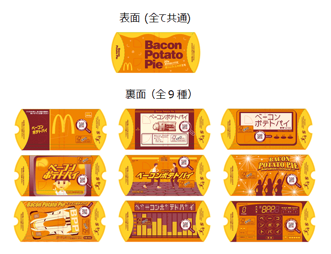 さらに、「ベーコンポテトパイ」をお召し上がりいただきながら、同商品が初登場したころの1990年代を思い出し、ほっこりと懐かしい気持ちになっていただきたいという想いを込めて、昨年に引き続き、その当時流行したカルチャーをモチーフとした、ポップで少しノスタルジックなデザインの数量限定パッケージでご提供いたします。全9種すべて昨年とは異なる新たなデザインにし、1990年代に青春時代を過ごした方には懐かしく、また、当時を知らない年代の方には新鮮に感じていただけるような、レトロで遊び心あふれるパッケージとともに、変わらないウマさをお楽しみください。