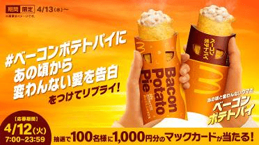 日本マクドナルド株式会社(本社:東京都新宿区、代表取締役社長兼 CEO:日色 保)は、人気のサイドメニュー「ベーコンポテトパイ」を4月13日(水)より、全国のマクドナルド店舗にて期間限定で販売いたします。また、商品の登場に合わせ、広末涼子さんを起用した新TVCMを4月12日(火)より放映いたします。