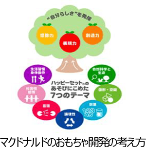 自分らしく生きていく力を育むことを目指し子供の発達支援の専門家とともに発達のための7つのテーマに沿って開発しています。https://www.mcdonalds.co.jp/menu/happyset/