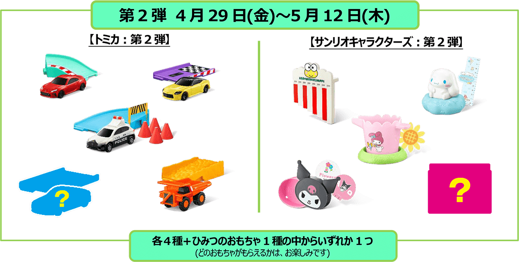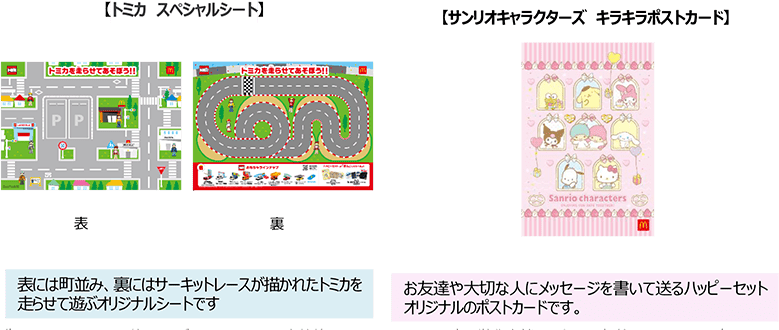 4⽉29⽇(金・祝)・30⽇(土)・5月1(日)の3⽇間は、ハッピーセット「トミカ」を1セットご購⼊につき「トミカ スペシャルシート」を、ハッピーセット「サンリオキャラクターズ」を1セットご購⼊につき「サンリオキャラクターズ キラキラポストカード」をプレゼントいたします。