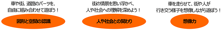 はたらく車がなぜ魅力的かというと、その色や形に、社会が必要とする仕事の意味が表されているからです。消防車が赤い理由、はしご車のはしごが長い理由を、おうちの方が一緒に遊びながら話題にしてみましょう。たくさんの車が行き交い、ビルが立ち並ぶ街の姿を観察する気持ちが高まり、「人々が働く社会」を想像する「ごっこ遊び」が発展します。「トミカ」の乗り物や街並みの情景パーツを手で動かして、街の姿を組み立てる内に、子供の頭の中の「想像の社会」が、おもちゃで可視化され、はたらく街のお話が広がるでしょう。