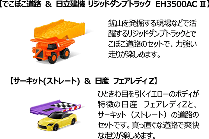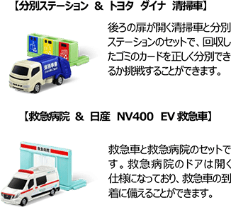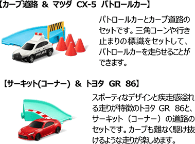 今年も毎年大人気の「トミカ」がハッピーセットに登場します。今回の発達のためのテーマは、図形や空間の認識、人や社会との関わりであり、遊びながら想像力も育みます。第1弾「トミカのまち」では、「救急病院 & 日産 NV400 EV救急車」などの働く車と街のパーツがセットになった全4種、第2弾「トミカの道路」では、スポーツカーが爽快にサーキット道を駆け抜ける「サーキット(ストレート) & 日産 フェアレディZ」など、車と道路のパーツがセットになった全4種とひみつのおもちゃ1種がラインアップ。消防車やスポーツカーなどの多彩な車と、マクドナルドレストランなどの街が作れるパーツや、様々な形の道路のパーツを組み合わせて遊ぶことで、「図形や空間の認識」を育みます。さらに、人や車が行き交う街の情景を思い浮かべ、車を走らせる「ごっこ遊び」を通して「人や社会との関わり」を考え、「想像力」を膨らませる遊びができます。また、第1弾、第2弾の街や道路のパーツを繋げると大きな街になります。自分だけの街を作って車を走らせる遊びが広がります。