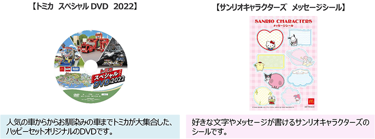 4⽉16⽇(⼟)・17⽇(⽇)の2⽇間は、ハッピーセット「トミカ」を1セットご購⼊につき「トミカ スペシャルDVD 2022」を、ハッピーセット「サンリオキャラクターズ」を1セットご購⼊につき「サンリオキャラクターズ メッセージシール」をプレゼントいたします。さらに、4⽉29⽇(金・祝)・30⽇(土)・5月1日(日)の3⽇間は、ハッピーセット「トミカ」を1セットご購⼊につき「トミカ スペシャルシート」を、ハッピーセット「サンリオキャラクターズ」を1セットご購⼊につき「サンリオキャラクターズキラキラポストカード」をプレゼントいたします。