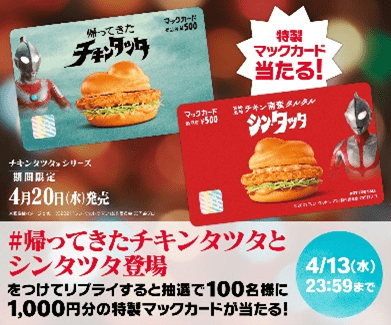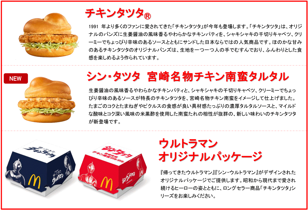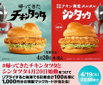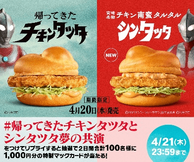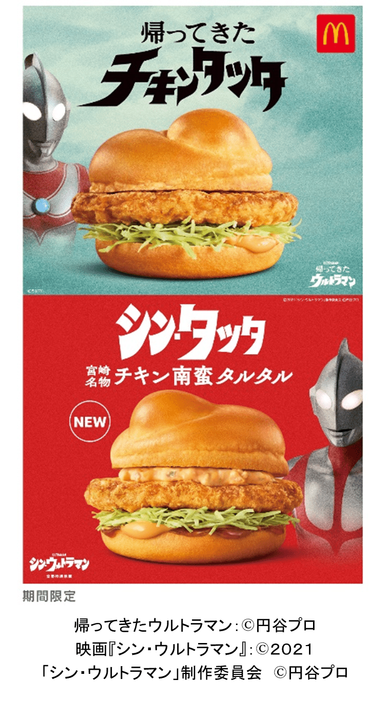 日本マクドナルド株式会社(本社:東京都新宿区、代表取締役社長兼CEO:日色 保)は、長年お客様にご愛顧いただいている「チキンタツタ」をより楽しんでいただきたいとの想いから、映画『シン・ウルトラマン』の公開に合わせ、「ウルトラマン」と「チキンタツタ」のコラボ企画を実施し、「チキンタツタ」と新商品「シン・タツタ 宮崎名物チキン南蛮タルタル」の2種のバーガーを、4月20日(水)から全国のマクドナルド店舗にて期間限定で販売いたします。また、「タツタシリーズ」の登場に合わせ、新たに5種のサイドメニューとドリンクもラインアップし、バーガーとドリンクはウルトラマンオリジナルパッケージでご提供いたします。