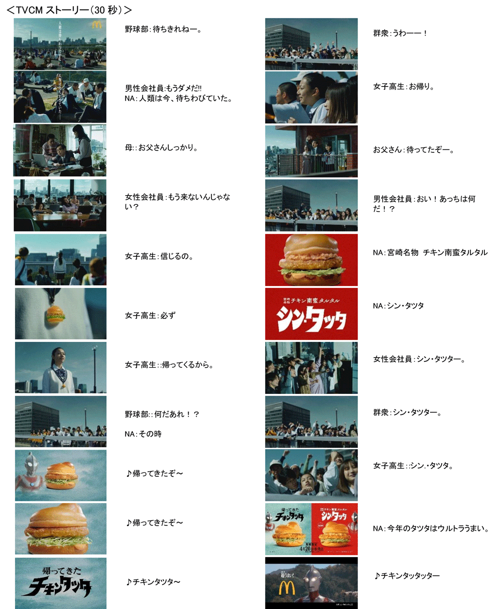 4月19日(火)から公開のTVCMは、『帰ってきたウルトラマン』主題歌の替え歌をBGMに、チキンタツタを待ち望む人たちの前にヒーローのごとく2つの期間限定商品が登場します。『帰ってきたウルトラマン』が放映された昭和時代を思わせるレトロな雰囲気の映像に、映画『シン・ウルトラマン』のシーンを組み合わせ、お子様から大人までお楽しみいただけるTVCMとなっています。このほか、Twitterキャンペーンなどの楽しい企画もあわせてお楽しみください。(詳細は下記を参照)。