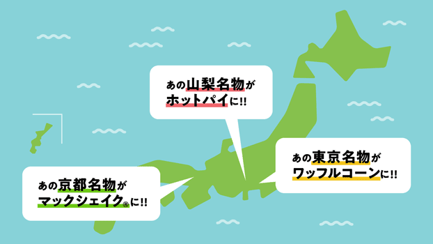 お手軽にちょっとした旅行気分を味わっていただきたいという想いから、日本のさまざまな地域の名物と、マクドナルドの人気スイーツとのコラボレーションが実現しました。この度登場するのは、京都府の辻利の抹茶を「マックシェイク」で、山梨県の桔梗信玄餅を「パイ」で、そして東京都の東京ばな奈を「ワッフルコーン」でお楽しみいただける3種のラインアップとなっております。