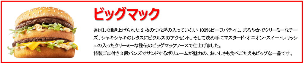 マクドナルドを代表する看板商品のひとつ「ビッグマック」は、特製ごま付きバンズや、香ばしく焼き上げられたつなぎの入っていないジューシーなビーフパティ、秘伝のビッグマックソースの絶妙な味わいと、口いっぱい頬張った時に感じる満足感が魅力のバーガーです。多くの方にボリューム満点の「ビッグマック」を楽しんでいただきたいという想いから、このたび「ビッグマックなんて、ペロリだよ。」キャンペーンを実施いたします。