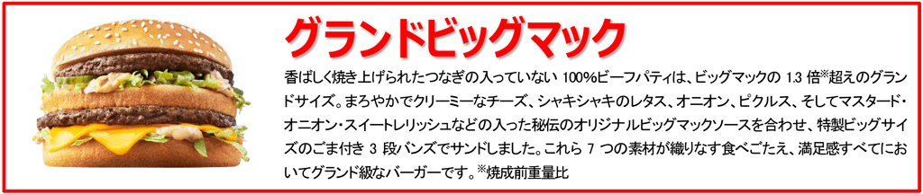「ビッグマック」の完成された味わいはそのままに、約1.3倍※2のグランドサイズの100%ビーフパティを使用した「グランドビッグマック」、そしてさらなる満足感と達成感が味わえる日本オリジナルの商品「ギガビッグマック※3」も期間限定で販売いたします。2016年の初登場から6回目の登場となる人気商品を、ぜひこの機会にお召し上がりください。