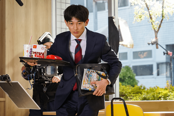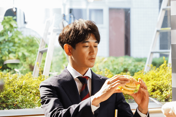 マクドナルドのカウンター席に座りビッグマックを食べるシーンでは、「ふだんビッグマック食べるの?」と、隣に並んだ高校生役の俳優と気さくに言葉を交わしていた竹原さん。撮影本番を迎え大きく口を開けてビッグマックを頬張ると「めちゃくちゃうまいです!」と満面の笑顔を見せました。バーガーの準備を待つ間にカメラテストを行う際も、竹原さんは「じゃあ“エア”で食べます」と食べる動作を披露。リアリティに満ちた口の動きやじっくり味わう表情を見たスタッフは「本当においしそう…」と顔を見合わせていました。