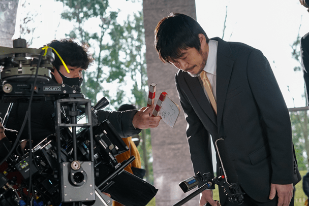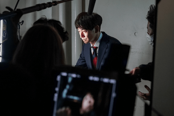 オフィスビルのエレベーターホールにスーツ姿で登場した竹原さんは、監督と演技の打ち合わせを終えるとウォーミングアップを兼ねて軽くシャドーボクシングの動きを披露するなど、万全のコンディションをアピール。カメラの前に立つと念入りにお辞儀の練習を繰り返しながら、身体を倒す角度やスピードをチェックしていました。本番ではさまざまな角度から撮影が行われましたが、顔が映らないカットでも常に“謝罪感”タップリの表情で深々と頭を下げる竹原さんの真剣な演技を、監督が絶賛していました。