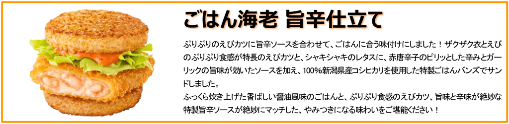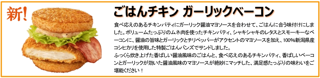 「ごはんチキン ガーリックベーコン」は、ごはんに合う味付けを追求して、食べ応えのあるチキンパティにガーリック醤油マヨソースを合わせた新商品です。ボリュームたっぷりのムネ肉をサクサクと軽やかな衣で包んだチキンパティ、シャキシャキのレタスとスモーキーなベーコンに、醤油の旨味とガーリックを効かせ、チリペッパーをアクセントとしたマヨソースを加えて、新潟県産コシヒカリを100%使用した特製のごはんバンズでサンドしました。「ごはん海老 旨辛仕立て」は、えびカツに赤唐辛子のピリッとした辛みとガーリックの旨味が効いた特製旨辛ソースを合わせた一品です。ふっくら炊き上げた香ばしい醤油風味のごはんと、ぷりぷり食感のえびカツ、旨味と辛味が絶妙な特製旨辛ソースがマッチした、やみつきになる味をお楽しみください。そして「ごはんてりやき」は、旨みに富んだポークパティに、しょうが風味の甘辛いてりやきソースを絡め、シャキシャキのレタスとスイートレモンソースを加えた「てりやきマックバーガー」の味わいと、ふっくら炊き上げた香ばしい醤油風味のごはんによる王道の組み合わせをご堪能いただくことができます。