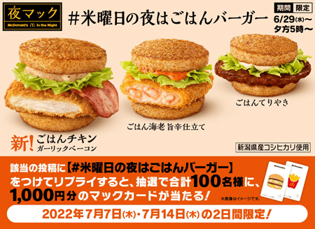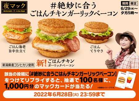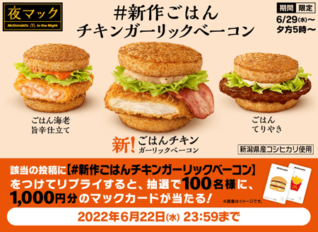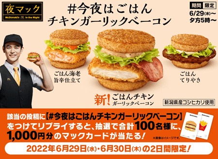 日本マクドナルド株式会社(本社:東京都新宿区、代表取締役社長兼CEO:日色 保)は、夕方5時からの「夜マック」の期間限定メニューとして、新潟県産コシヒカリを100%使用した新商品「ごはんチキン ガーリックベーコン」を発売します。また、2021年9月の販売時にご好評をいただいた「ごはん海老 旨辛仕立て」と「ごはんてりやき」も同時にラインアップし、6月29日(水)から全国のマクドナルド店舗にて3種のごはんバーガーを期間限定で販売いたします。