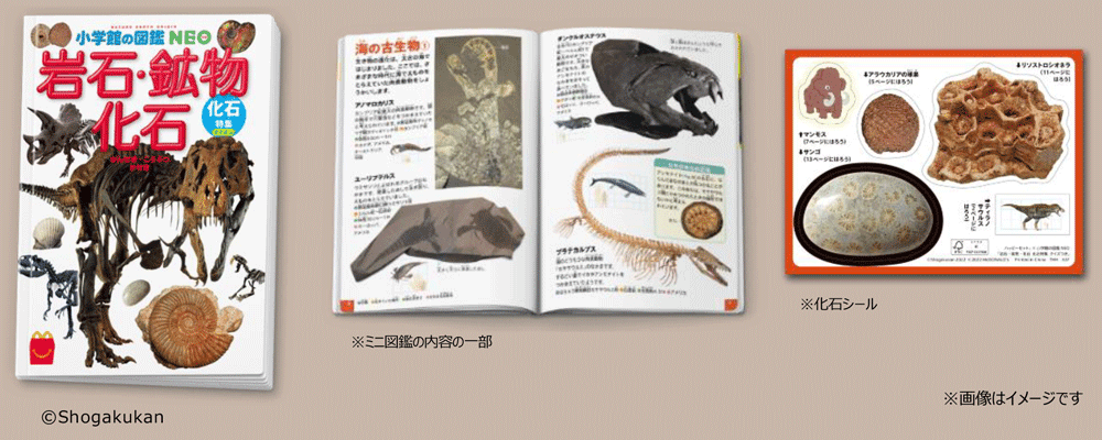 ミニ図鑑「岩石・鉱物・化石/化石特集 クイズつき」は、「小学館の図鑑NEO」をもとにハッピーセットのために編集・構成されており、今回はティラノサウルス、マンモスなど大昔に生きていた生物たちの生態を詳しく解説しています。巻末には楽しいクイズも付いているほか、図鑑内に貼って楽しめる化石のシール付きです。また、子育てサイト「未来へいこーよ」の企画として、ドナルドがイベントの進行役を務め、夏休みに親子で一緒に楽しく化石への知識を深めるオンラインイベントを開催します。