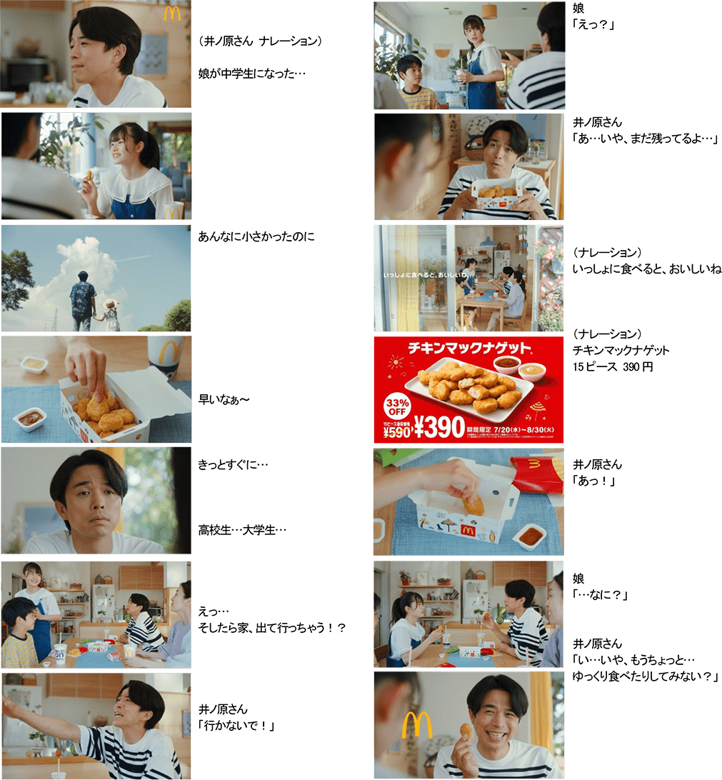 「チキンマックナゲットの顔」として2022年のキャンペーンキャラクターを務めている井ノ原快彦さんを起用した新TVCM「子供と過ごせる時間」篇を、7月19日(火)から放映します。前作では、靴下を履き間違えたり、ムキになって子供と張り合う“大人げないパパ”を演じた井ノ原さんですが、第2弾となる本作では、娘の成長に対する喜び、そして自分から離れていく淋しさで胸をいっぱいにする優しい父親を熱演。愛する子供たちと一緒にすごせる貴重な時間を、楽しい時間になるよう努める父親の心情を描いた、心温まるストーリーをお楽しみください。