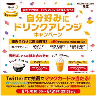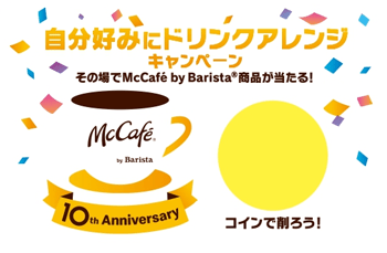 日本マクドナルド株式会社(本社:東京都新宿区、代表取締役社長兼CEO:日色 保)は、専任バリスタが「本格カフェコーヒー」を提供するコーナー“McCafé by Barista”(マックカフェ バイ バリスタ)が2012年7月に一号店をオープンして以来、今年で10周年を迎えたことを記念して、全国のMcCafé by Baristaのバリスタ約1,000名が選ぶ人気メニューランキングを発表します。また10周年の感謝の気持ちを込めて、8月1日(月)からは、McCafé by Barista店舗でドリンクの有料カスタマイズをしていただいたお客様を対象に、抽選でMcCafé by Baristaの商品や10周年限定デザインのマックカードが当たる、『自分好みにドリンクアレンジキャンペーン』も実施いたします。