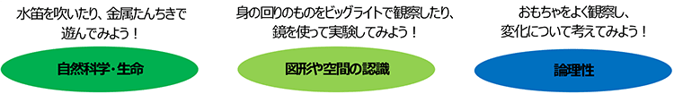 今回のおもちゃのテーマは、自然科学と生命に親しみ、図形・空間の認識を深め、論理性を楽しく考えることです。水の量によって音階が変化する水笛を使った遊びや、ドラえもんの金属たんちきで、金属や磁石のありかを探す遊びなどは、「自然科学」への興味を引き出します。ビッグライト、スモールライトを使って身の回りの物をよく見たり、動く鏡を使ってドラえもんの数が増えるのを観察したりすることは、「図形・空間」の見え方への関心を高めます。また、おもちゃで遊ぶことで、「なぜ、水の量で音階が変わるの?」「レンズで見ると、どうして大きく見えるのかな?」など、観察したことの理由を考えるようになれば、それは、「論理的」な思考の始まりなのです。各おもちゃに付属の「ドラえもん わくわくじゆう研究リーフレット」には、遊びを通して発見したことや、自分で気づいたことを記録することができ、自由研究をご家族や友達へ伝えることもできます。