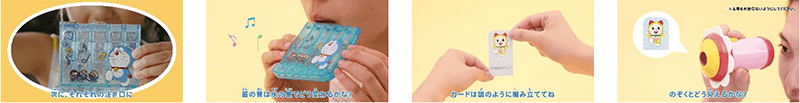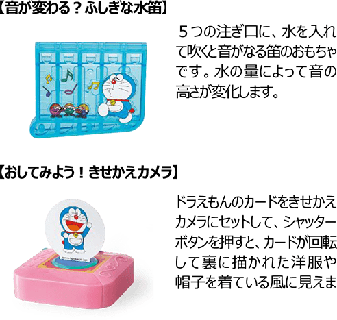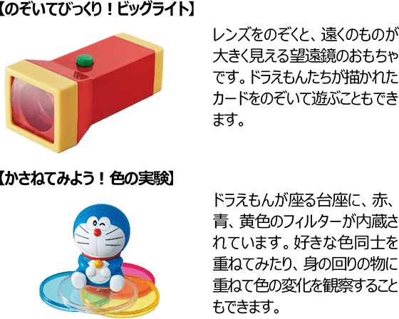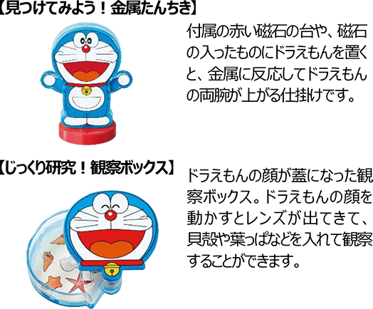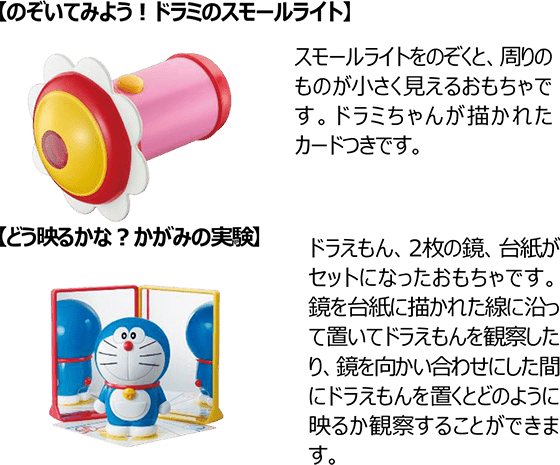 第1弾には、レンズをのぞくと身の回りのものが大きく見える「ビッグライト」、水の量によって笛の音階が変化する「水笛」などの4種が登場します。そして続く、第2弾には、磁石などの金属にドラえもんが反応する「金属たんちき」、鏡を使って様々な角度からのドラえもんを観察する「かがみの実験」などのおもちゃ4種と、お家時間や外遊びが充実するラインアップとなっております。