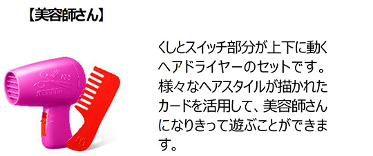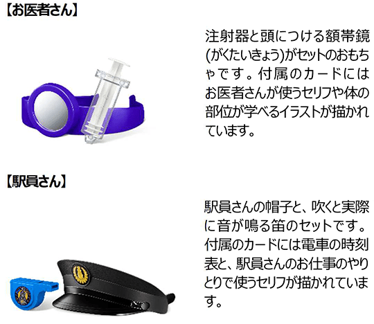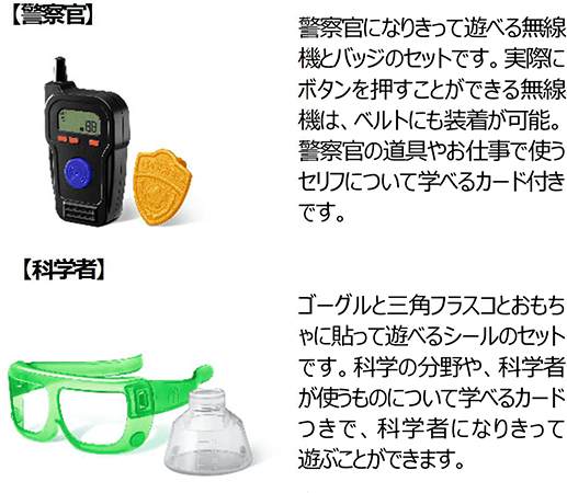 子供たちに人気の職業をモチーフとした、お仕事のごっこ遊びが楽しめる「なりきり!プロキット」が今年もハッピーセットに登場します。お仕事で使うアイテムを模したおもちゃと、実際にお仕事で使うセリフなどが学べるカードがセットになったプロキットは全6種。無線機とバッジがセットの「警察官」、頭につける額帯鏡(がくたいきょう)と注射器がセットの「お医者さん」などの人気の職業に加え、今年はゴーグルと実験用の三角フラスコがセットの「科学者」、様々なスタイリングができる、くしとヘアドライヤーがセットの「美容師さん」など幅広いお仕事を体験できるラインアップです。今回のおもちゃは、いろいろな職業をテーマにした「ごっこ遊び」を通して、人と関わる社会性や言語のコミュニケーションの力と、仕事の役割を思い浮かべて演じる想像力を育みます。それぞれの職業のプロになりきる遊びを楽しみながら、人と「社会」との繋がりも学びます。また、お仕事で使う言葉づかいを、付属のカードでおぼえて遊ぶうちに、大人の「言語表現」に親しめます。ご家族や友達と一緒に、いろいろな仕事のシーンを「想像」しながら、やりとり豊富なごっこ遊びをお楽しみください。