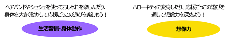 ハローキティのような「かわいい」アイドルは、アクセサリーや持ち物に気配りをして、身だしなみを整えていることを、幼児は細かく観察しています。大好きなアイドルを心に想像するようになると、アイドルは子どもの行動のモデルとなって、身だしなみの生活習慣は急速に形成されるのです。アイドルを象徴する、小さなアクセサリーや持ち物が、アイドルをまねしたり、応援したりする遊びを盛り上げます。アイドルと一緒にダイナミックなダンスで身体表現する経験は、お子さんの「自分らしさ」の幅を広げてくれるでしょう。
