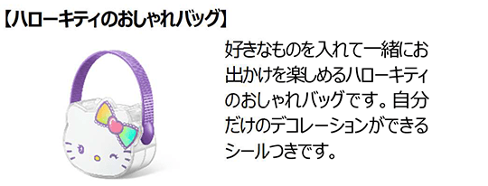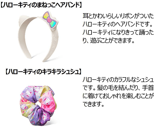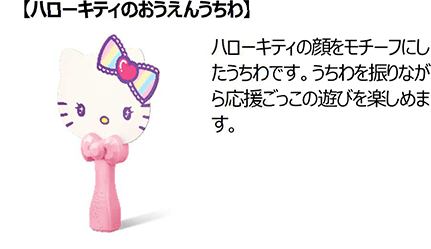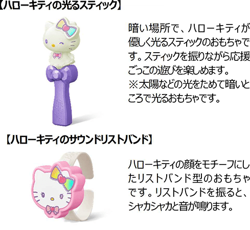 ハッピーセット「ハローキティ」は、アイドルのようにキラキラリボンを着けたハローキティと一緒におしゃれを楽しんだり、応援ごっこで、遊んだりできるおもちゃです。第1弾では、ハローキティになりきっておしゃれを楽しむ「ヘアバンド」、「おしゃれバッグ」などの全3種、つづく第2弾では、応援ごっこの遊びにぴったりの「光るスティック」、「おうえんうちわ」など全3種が登場します。今回のおもちゃのテーマは、身だしなみを整える生活習慣と、ダンスや応援をする身体動作。そして、「ごっこ遊び」を通して、ストーリーを思い浮かべる想像力を育みます。ヘアバンドを身につけて、自分のお気に入りのものをバックにいれてお出かけの支度をする遊びは、「生活習慣」の形成を助けます。また、光るスティックや音の鳴るリストバンドを使ってリズミカルに「身体」を大きく動かす遊びもできます。ハローキティになりきったり、応援ごっこの「想像」を膨らませたりしながら、楽しく遊ぶことができます。