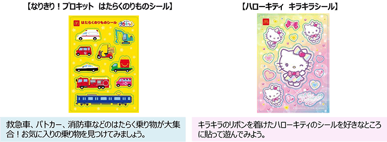 9⽉3⽇(⼟)・4⽇(⽇)の2⽇間は、ハッピーセット「なりきり!プロキット」を1セットご購⼊につき「はたらくのりものシール」を、ハッピーセット「ハローキティ」を1セットご購⼊につき「キラキラシール」をプレゼントいたします。