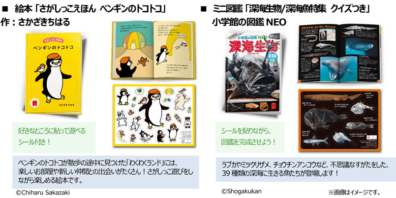 また、絵本「さがしっこえほん ペンギンのトコトコ」、ミニ図鑑「深海生物/深海魚特集 クイズつき」も9月2日(金)よりハッピーセットに新登場いたします。絵本とミニ図鑑には、シールがそれぞれついてきます。