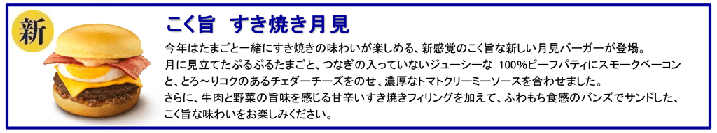 「月見バーガー」は、月を愛でる秋の風習“お月見”をイメージして1991年に誕生して以降、毎年秋にご提供している人気商品です。月に見立てたぷるぷるたまごとつなぎの入っていないジューシーな100%ビーフパティにスモークベーコンをのせ、クリーミーで濃厚なトマトクリーミーソースを合わせ、香ばしいゴマ付きバンズでサンドした、この季節にしか味わえない味をお楽しみいただけます。新登場の「こく旨 すき焼き月見」は、月見バーガーの味わいに、牛肉と野菜の旨味を感じる甘辛いすき焼きフィリングを加え、ふわふわ食感の新バンズでサンドした、ビーフのおいしさをご堪能いただける一品です。このほか、定番の「チーズ月見」、朝マックの「月見マフィン」も販売し、朝から夜まで1日を通して計4商品のバーガー・マフィンをお楽しみいただける充実のラインアップとなっております。