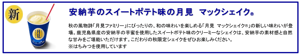 スイーツでは、マロンペーストを配合したソースと栗風味のスポンジケーキがソフトクリームのおいしさを引き立てる「栗のモンブランの月見 マックフルーリー」と、鹿児島県産安納芋の芋蜜を使用した「安納芋のスイートポテト味の月見 マックシェイク」が新たに登場するほか、あんことおもちの絶妙なコンビネーションで毎年ご好評いただいている「月見パイ」と合わせて、秋らしい和風味のスイーツ3種をご用意しました。さらに、サイドメニューでは「チキンマックナゲット」を和のテイストで味わっていただける秋にぴったりな「柚子七味ソース」が新登場します。