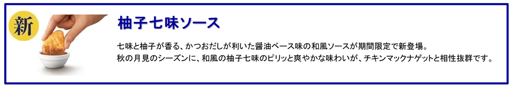 | 柚子七味ソース | 「チキンマックナゲット®」を ご購入いただくことで お楽しみいただけます。(※5) |