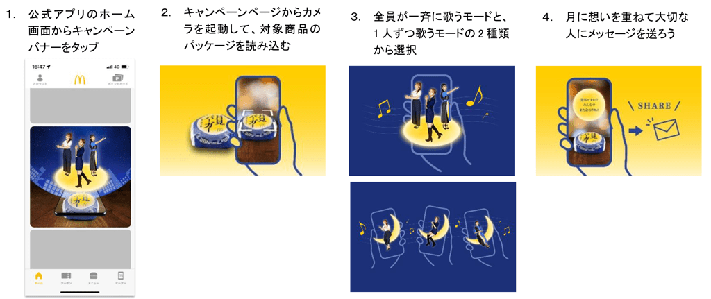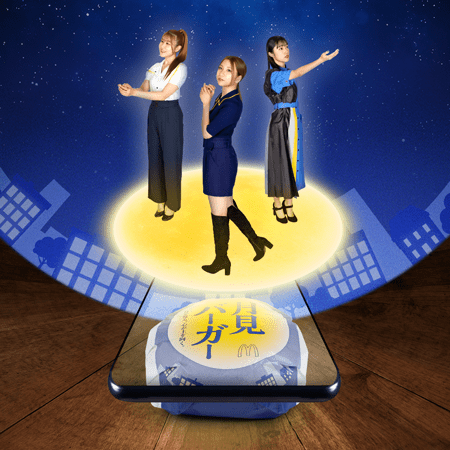 マクドナルド公式アプリからアクセスできるキャンペーンページからカメラを起動し、対象商品の月見限定パッケージを読み込むことで視聴可能です。視聴方法はスマートフォンの台数によって様々な楽しみ方ができるよう、2パターンご用意しました。1台でパッケージを読み込むと、リトグリメンバー3人が同時に登場し、3人全員で歌う「三日月」をお楽しみいただけます。複数台持ち寄れば、リトグリメンバー3人それぞれが各スマートフォンにソロで登場し、スマートフォンをまたいでのハモりをお楽しみいただけます。