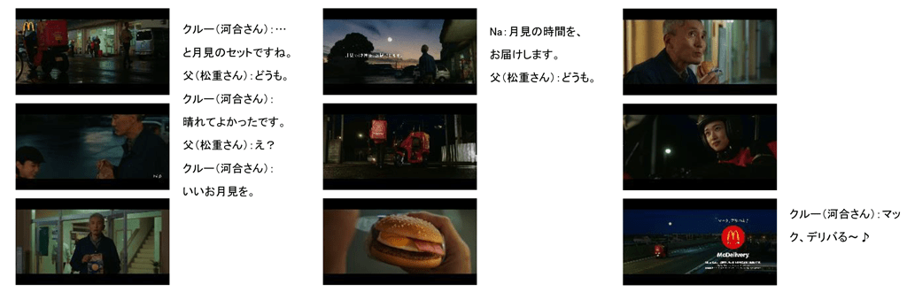 9月6日(火)から公開のTVCMは、「月を見る。心が上を向く。」というテーマのもと4年目を迎え、月を見上げることで大切な人とつながる幸せな気持ちを、絢香さんが歌う楽曲「三日月」にのせて描いた作品です。今年は松重 豊さん、藤野 涼子さんが演じる親子の大切なつながりを描いたストーリーを通じ、本商品の魅力をお伝えします。また同じく松重 豊さん演じる父親と、河合 優美さん演じるデリバリークルーとのやり取りを描いたマックデリバリー®の新TVCMも併せて公開し、マックデリバリーの魅力をお伝えします。各種施策ではTwitterキャンペーンや、マクドナルド公式アプリ限定でお楽しみいただけるLittle Glee Monsterが歌う「三日月」のARコンテンツもご用意しておりますので、あわせてお楽しみください。(詳細は下記を参照)