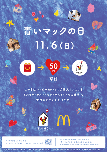 11月6日(日)に、ハッピーセットのご購入1つにつき50円を、日本マクドナルド株式会社またはそのフランチャイズ法人より、病気と闘う子供とその家族のための滞在施設「ドナルド・マクドナルド・ハウス」を運営するドナルド・マクドナルド・ハウス財団へ寄付させていただきます。