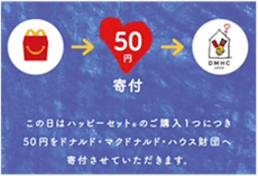 「マックハッピーデー」は、全国のマクドナルドでハッピーセットのご購入1つにつき50円を、マクドナルド*2からDMHを運営する公益財団法人ドナルド・マクドナルド・ハウス・チャリティーズ・ジャパンに寄付させていただくチャリティ活動です。
