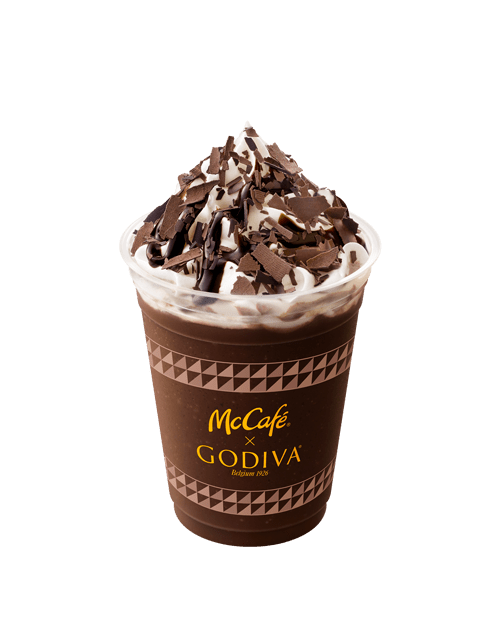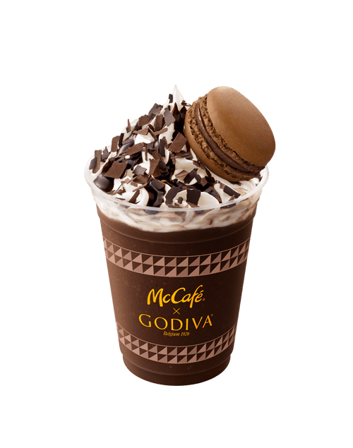 大人気の“GODIVA”と“McCafé”がコラボレーションしたフラッペが新しくなって期間限定で登場!ベルギー産チョコレートを使用したダークチョコシロップとシェイブチョコレートを混ぜ合わせたチョコレートドリンクに、ホイップクリームとチョコソースとシェイブチョコレートをトッピング。さらにマカロン チョコレートを添えました。カカオの深みある香りと、甘みとほどよい苦みが重なるチョコレートの濃厚なおいしさをお楽しみいただける、今日を特別にしてくれるようなGODIVA監修の至福のチョコづくしフラッペです。
