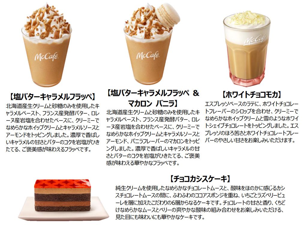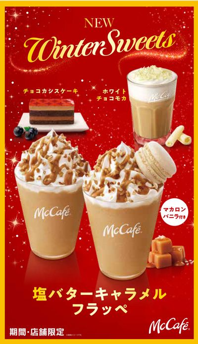 日本マクドナルド株式会社(本社:東京都新宿区、代表取締役社長兼CEO:日色 保)は、専任バリスタが「本格カフェコーヒー」を提供するコーナー“McCafé by Barista®”(マックカフェ バイ バリスタ)併設のマクドナルド店舗にて、新作の「塩バターキャラメルフラッペ」「塩バターキャラメルフラッペ & マカロン バニラ」「ホワイトチョコモカ」の3種のドリンクと新作ケーキの「チョコカシスケーキ」を12月7日(水)より期間限定で販売いたします。また、同時に一部のマクドナルド店舗でも「塩バターキャラメルフラッペ」「塩バターキャラメルフラッペ & マカロン バニラ」の2種を販売いたします。