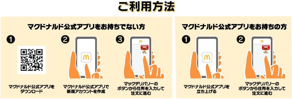 マックデリバリーのご利用は、『アプリ』と『WEBサイト』からご注文いただけます。