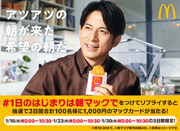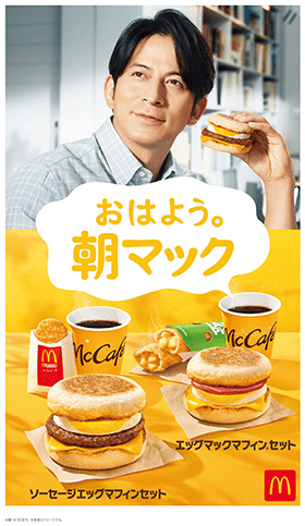 日本マクドナルド株式会社(本社:東京都新宿区、代表取締役社長兼CEO:日色 保)は、「ソーセージエッグマフィン」や「エッグマックマフィン®」「ハッシュポテト」など、いい一日のスタートにぴったりな、できたてで温かい朝食をお楽しみいただける「朝マック」を朝10時半までのモーニングメニューとしてご提供しています。マクドナルド店舗でのお食事はもちろん、仕事が忙しい皆さまにもあたたかい「朝マック」をオフィスで味わっていただくなど、身近な朝食としての魅力をお伝えするため、岡田准一さんと山田杏奈さんが出演する新TVCMを1月16日(月)から放映いたします。