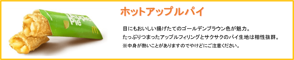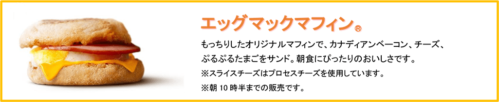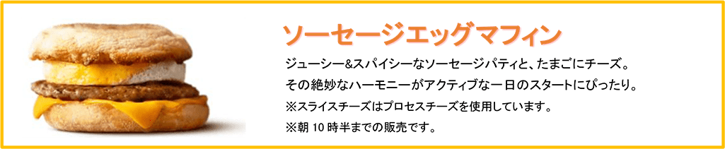 「ソーセージエッグマフィン」は、ジューシー&スパイシーなソーセージパティと、たまごにチーズをもっちりしたオリジナルマフィンでサンドした一品です。「エッグマックマフィン」はもっちりしたオリジナルマフィンで、カナディアンベーコン、スライスチーズ、ぷるぷるたまごをサンドしました。人気のサイドメニュー「ハッシュポテト」は、外はカリッとゴールデンブラウン。中はしっとりホクホクで、軽い塩味とザク切りポテトの食感が一日のスタートにぴったりの商品で、朝マックだけでお楽しみいただけます。「ホットアップルパイ」は、目にもおいしい揚げたてのゴールデンブラウン色が魅力で、たっぷりつまったアップルフィリングとサクサクのパイがプレミアムローストコーヒーとも相性抜群のスイーツメニューです。