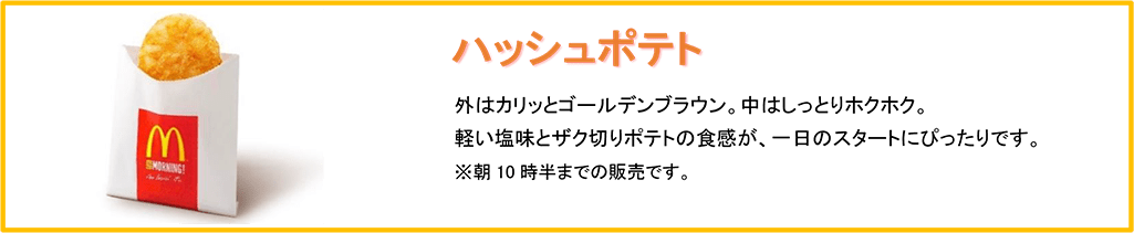 マクドナルドでは、一日を通して様々な商品をお楽しみいただけるよう、時間帯で異なるメニューをご提供しており、朝10時半までの時間帯では「朝マック」として、「ソーセージエッグマフィン」や「エッグマックマフィン」、たっぷりのシロップとバターがしみ込んだおいしさが特長の「ホットケーキ」や「ハッシュポテト」などをご提供しております。バーガーは単品でのご提供のほか、ドリンクとサイドメニューを組み合わせた「バリューセット®」やドリンクと組み合わせた「コンビ」など、お得なセットメニューもご用意しております。