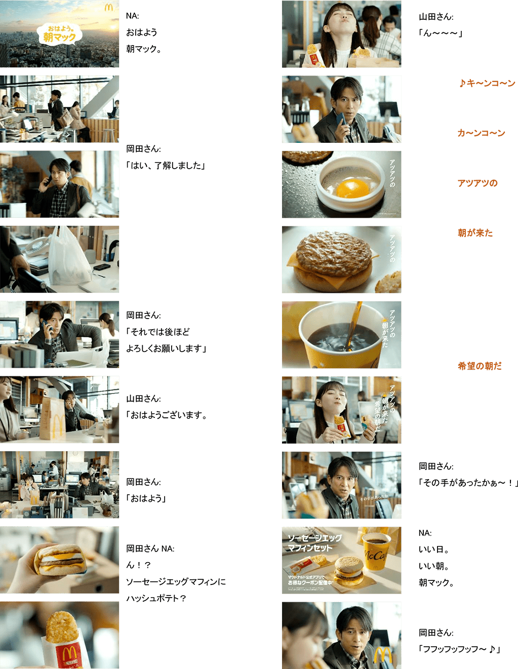 そんな「朝マック」の魅力をお伝えする新TVCMを、1月16日(月)より放映します。本TVCMでは、マクドナルドのCM出演3作目となる岡田准一さんと、山田杏奈さんが初共演。「いい日。いい朝。朝マック」をキーワードに、「朝マック」からスタートする、オフィスの朝のひとコマを描きます。忙しさのあまり手軽な商品で朝食をすませようとする岡田さんですが、隣のデスクで温かい「ソーセージエッグマフィン」と「ハッシュポテト」をおいしそうに頬ばる山田さんの笑顔を見て「オフィスで朝マック」という選択があったことに気づきます。「その手があったかぁ!」と、心の衝撃を全力で表現する岡田さんのリアクションにご注目ください。