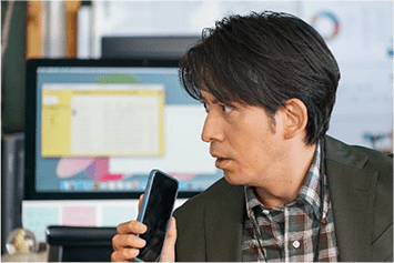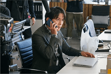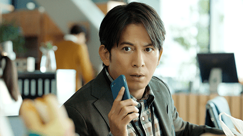 オフィスに出勤する場面から撮影をスタートした岡田さんは、動きやセリフをチェックしながら「爽やかに言ったほうがいいかな?それともデキる人っぽく?」と、キャラクターの表現まで入念な打ち合わせを行いました。デスクに着席するシーンでは、イスがスムーズに動くようキャスターを丁寧に揃える細やかな気遣いに「優しいね。二十何年やってて、こんなに優しくしてもらったことないよ!」と感激。監督のOKが出ると「イスのおかげだね。余計なことを考えずにすんだから。ありがとう」とスタッフに感謝の言葉を伝えました。