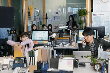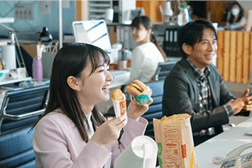 山田さんの朝食が朝マックであることに気づき岡田さんが立ち上がるシーンでは、急な動きに周囲の社員も驚く設定でしたが、岡田さんがあまりにも勢いよく立ち上がったためイスが弾き飛ばされ後方のデスクに激突。大きな音と衝撃に撮影スタッフまでが本気で驚くハプニングも。岡田さんは「大丈夫だった?」と周囲を気遣いながらも「次はそっち狙うからね~(笑)」とジョークをまじえながらニッコリ。次のテイクでは現場にいる全員が岡田さんの“本気のアクション”に備え、無事に撮影を終えることができました。