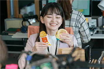 山田さんは、紙バッグからソーセージエッグマフィンとハッシュポテトを取り出すシンプルな撮影でも、やや緊張気味の表情。感覚をつかむように何度もテストをくり返す中で、隣の席に座っている岡田さんに「持ち方って…これでいいですか?」と相談しました。「オレ、何か言われたっけな~?キレイに見えていれば大丈夫だと思うよ(笑)」と明るく答える岡田さんの笑顔を見てリラックスした山田さんは、その後すぐにOKテイクを獲得することができました。