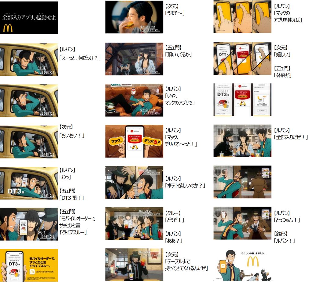 今回の新TVCMは、ルパン、次元、五ェ門に加えて、銭形警部が本コラボレーションCMに初めて登場する、オリジナル書き下ろしストーリーです。新CMは次元が慣れた様子で、「席から注文(オーダー)できるテーブルサービス」を利用する様子や、銭形警部とのコミカルなやり取りなど、ルパン一味がマクドナルド公式アプリの「うれしい体験、全部入り。」を楽しく紹介しています。