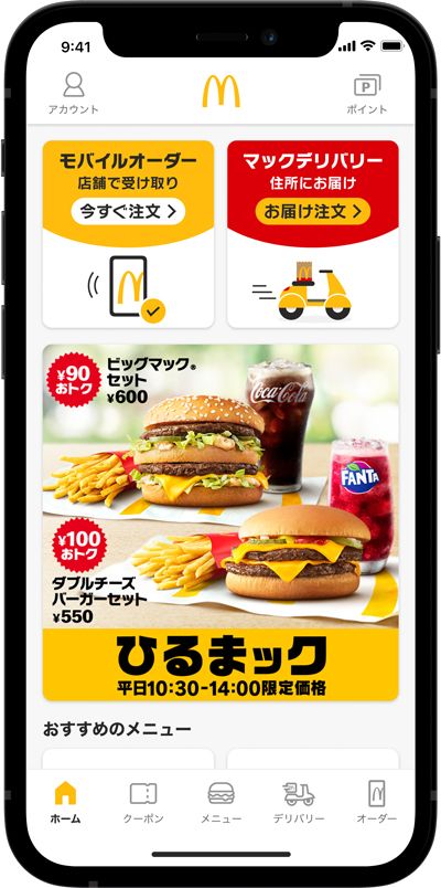 マクドナルド公式アプリは、2010年の導入以来、多くのお客様にご活用いただいております。お得なクーポン配信などに加え、スマートフォンで事前注文&決済で様々な受け取り方法が選べる「モバイルオーダー」機能や、2022年11月には「マックデリバリーサービス」機能も統合され、利便性が向上しただけでなく、快適な店舗体験やFUNをお届けするうれしい機能がたくさん体験できるアプリです。