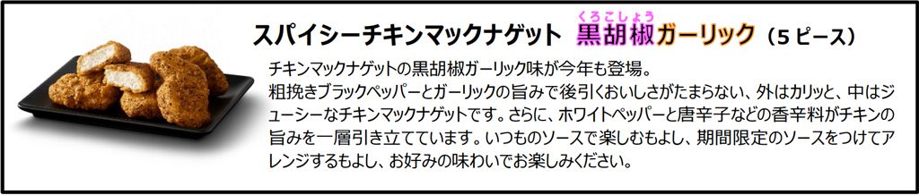 「スパイシーチキンマックナゲット 黒胡椒ガーリック」は、2022年1月に初登場して大変ご好評いただいた、粗挽きブラックペッパーとガーリックの旨みで後引くおいしさが特長のチキンマックナゲット®です。外はカリッと、中はジューシーに仕上げ、さらにホワイトペッパーと唐辛子などの香辛料がチキンの旨みを一層引き立てていて、ペッパーのピリッとした辛さが大人も楽しめるおいしさです。